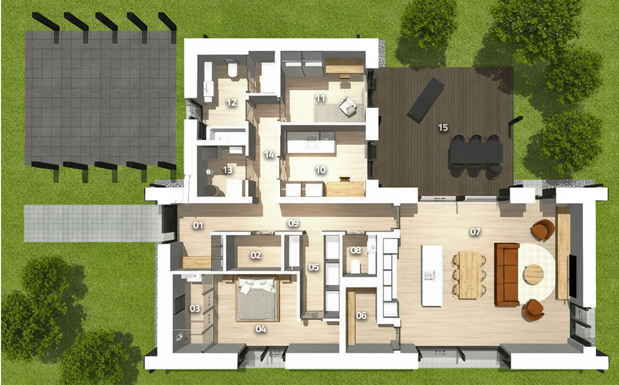 Varianta zahrnuje napojení na inženýrské sítě, oplocení a venkovní hrubé terénní úpravy.